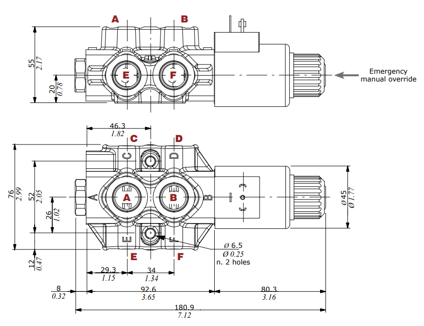 Walvoil DFE052 Solenoid Diverter Valve 6 Way 3/8" BSP, 12V DC, Closed Centre, Drain Port, 60 L/min, 315 Bar, Galvanized